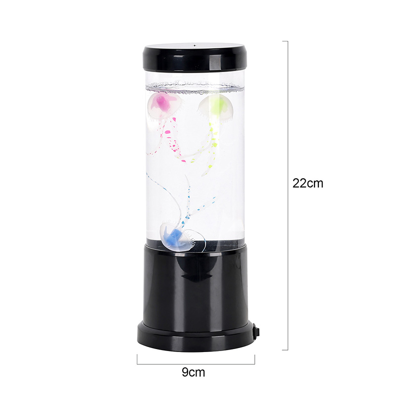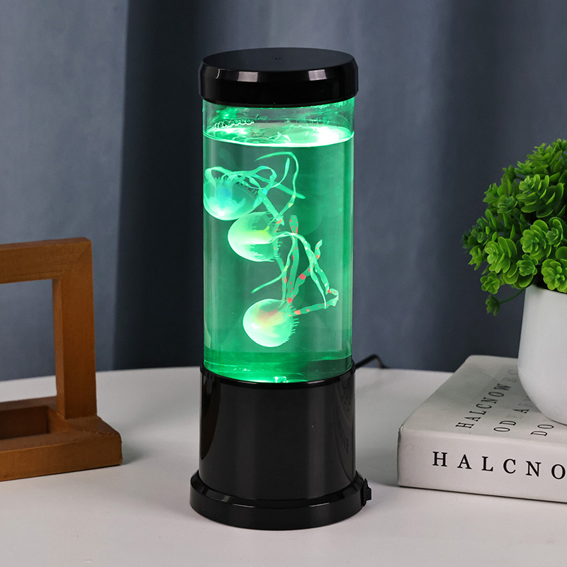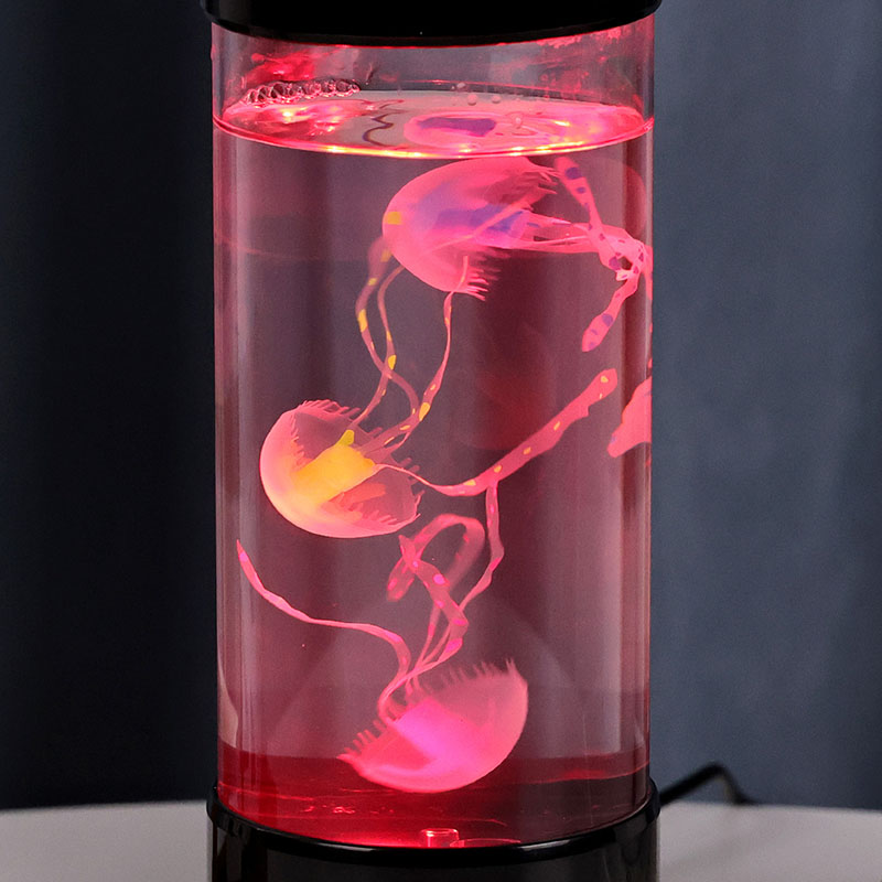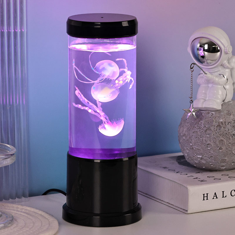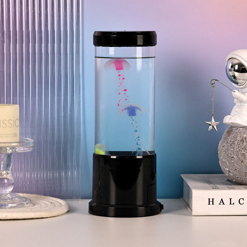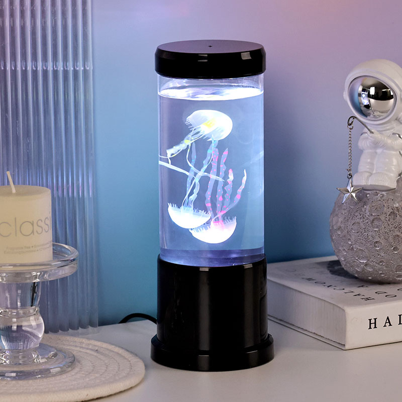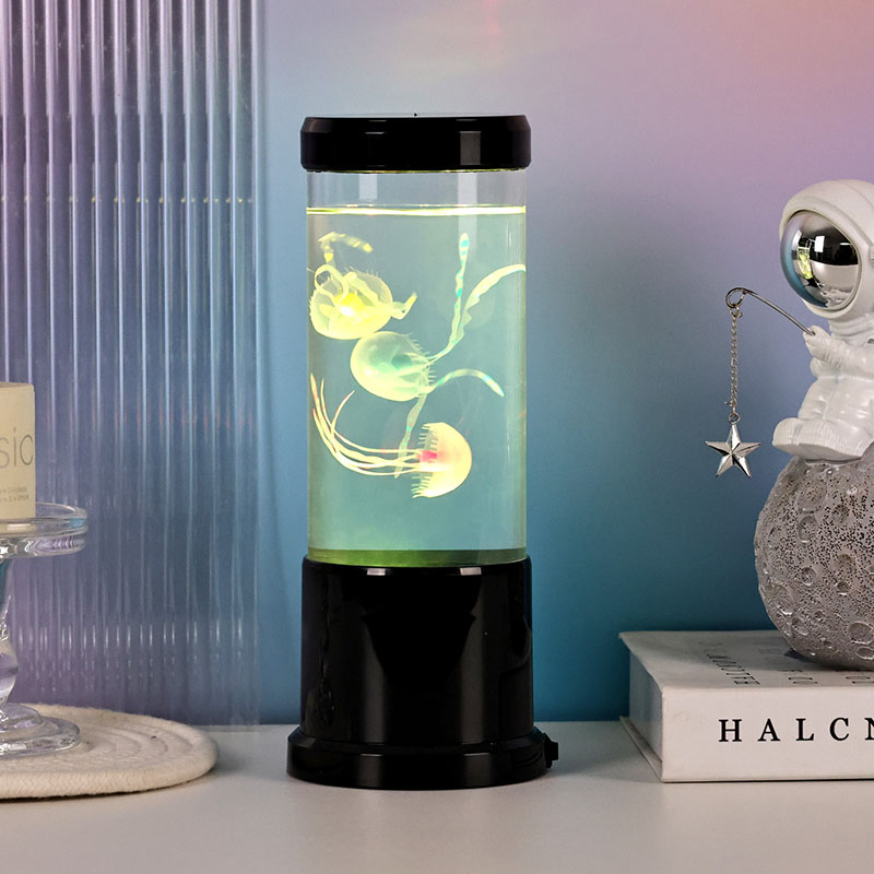 lampu menampilkan ubur-ubur warna hitam yang hidup dengan lembut mengambang di dalam tangki silinder bening, menciptakan suasana bawah air yang menenangkan yang mengubah ruangan mana pun menjadi tempat peristirahatan samudera yang tenang.