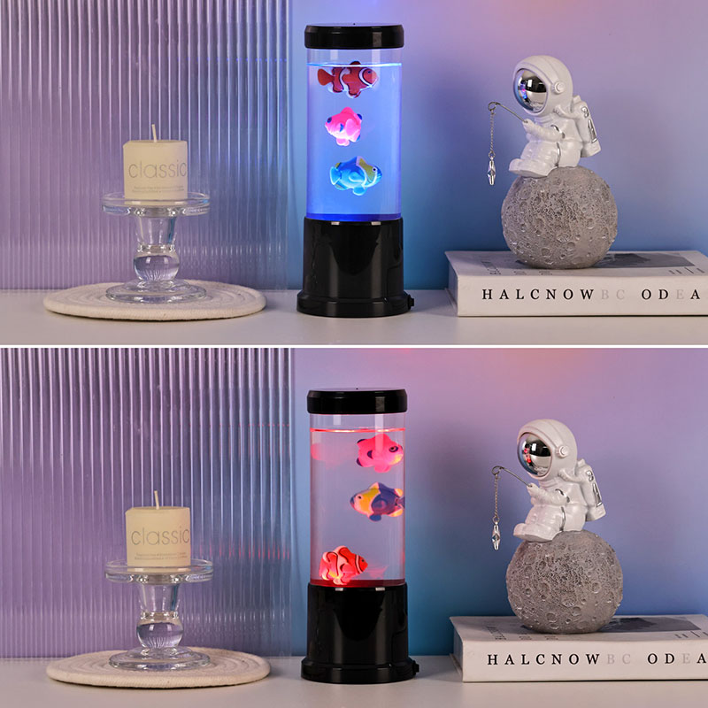 Keajaiban sebenarnya terletak pada tangki yang menyala, tempat ubur-ubur buatan meluncur dengan anggun dalam cairan seperti air, didukung oleh sistem sirkulasi internal. Ubur-ubur tembus pandang ini dirancang secara rumit dengan tentakel bercahaya dan tubuh lembut berdenyut yang meniru gerakan alami makhluk laut asli. Pencahayaan dinamis meningkatkan efek ini, memancarkan cahaya halus ke sekeliling Anda.