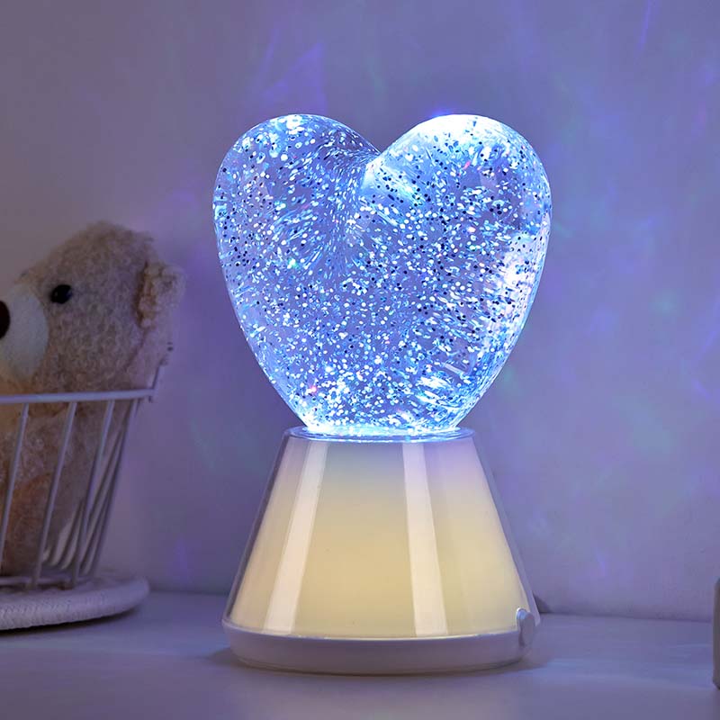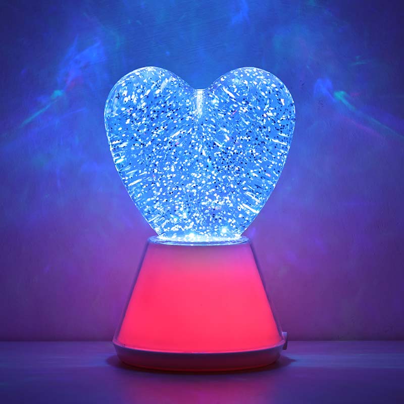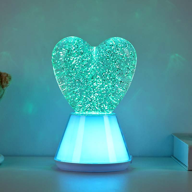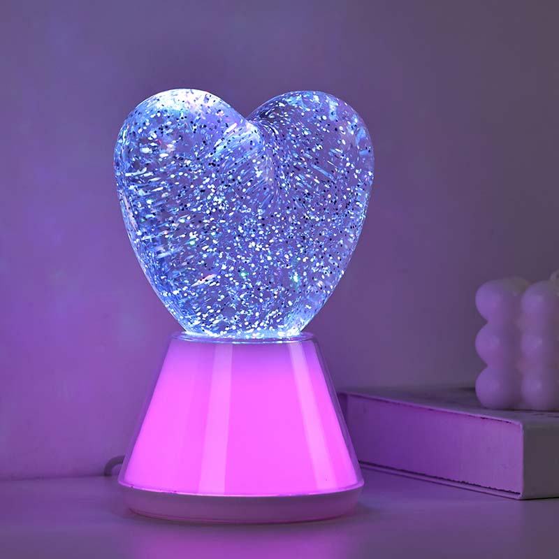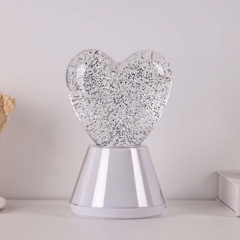 Lampu Malam Glitter Cair Berubah Warna Dengan Naungan Hati. menampilkan bola kaca indah berisi cairan misterius, di mana payet berkilauan mengapung. Ajaibnya, Cahaya Malam Berkilau Cair Berubah Warna Dengan Naungan Hati seolah menari di dunia magis.