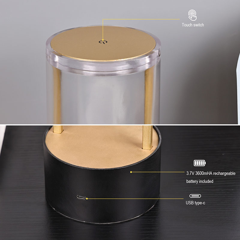 Bagian atas Lampu Meja Kecil Gaya Lentera adalah sakelar lampu sensitif sentuhan, dengan kepala pengisi daya tipe c yang dapat diisi ulang di bagian bawah. Bagian atas terdiri dari penutup akrilik transparan, dan bagian bawah terbuat dari dasar logam. Struktur melingkar keseluruhan memungkinkan pencahayaan bergerak