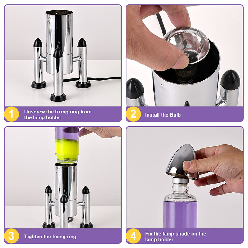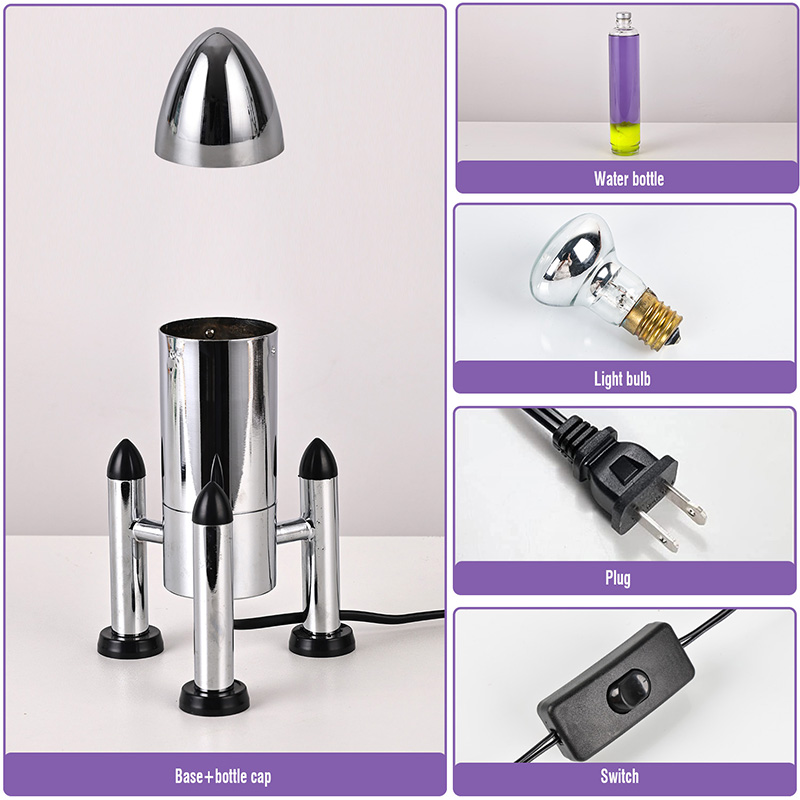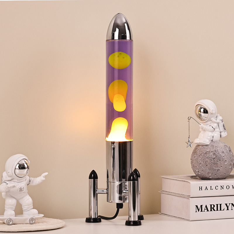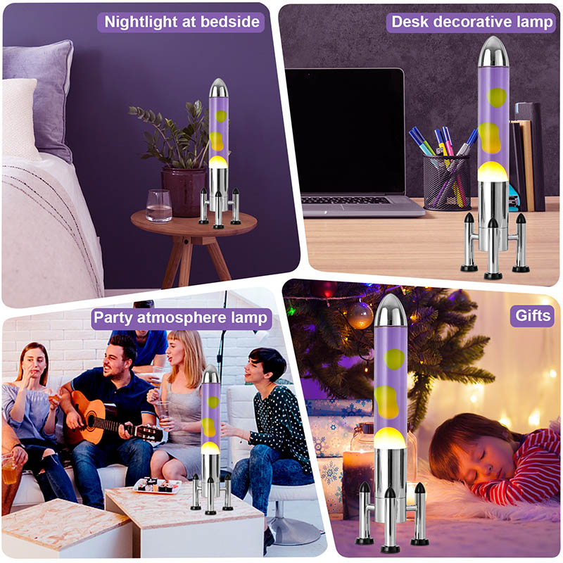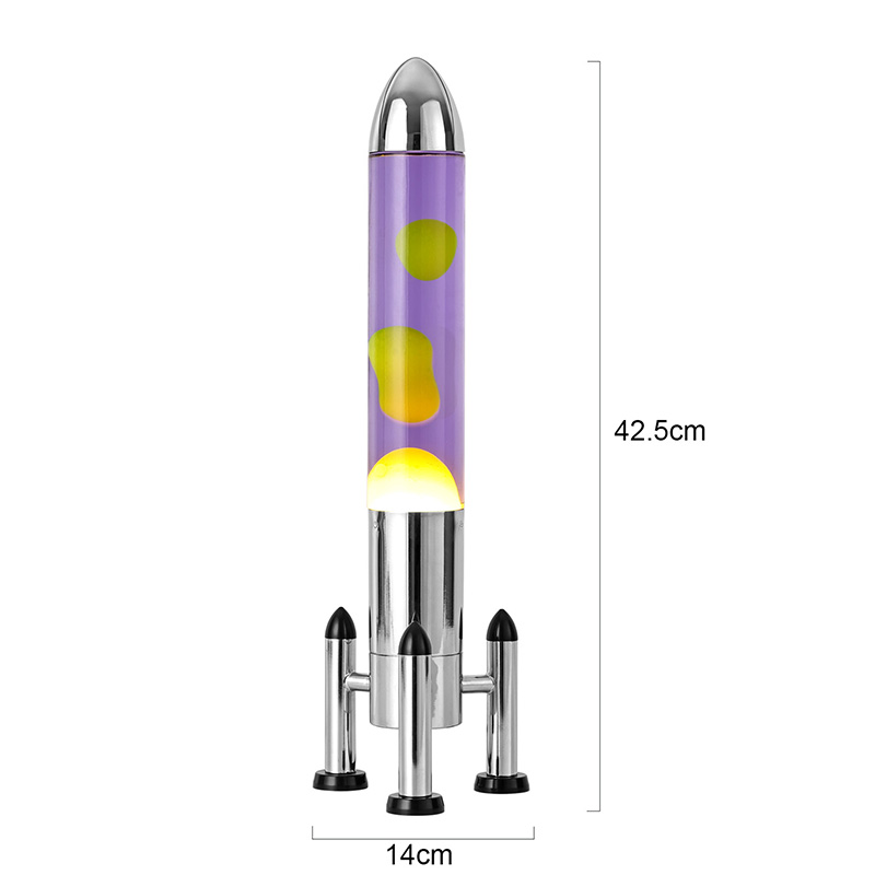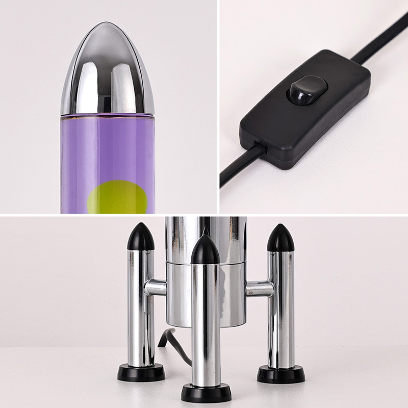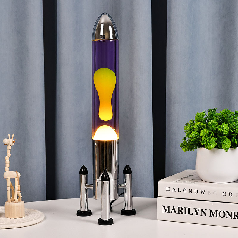 24VLampu Lava LED besar dengan kap roket menampilkan desain klasik berbentuk roket, dengan cangkang logam berwarna perak dipadukan dengan bodi botol kaca transparan, simpel namun bergaya. Kuning mengapung di dalam cairan ungu di dalamnya