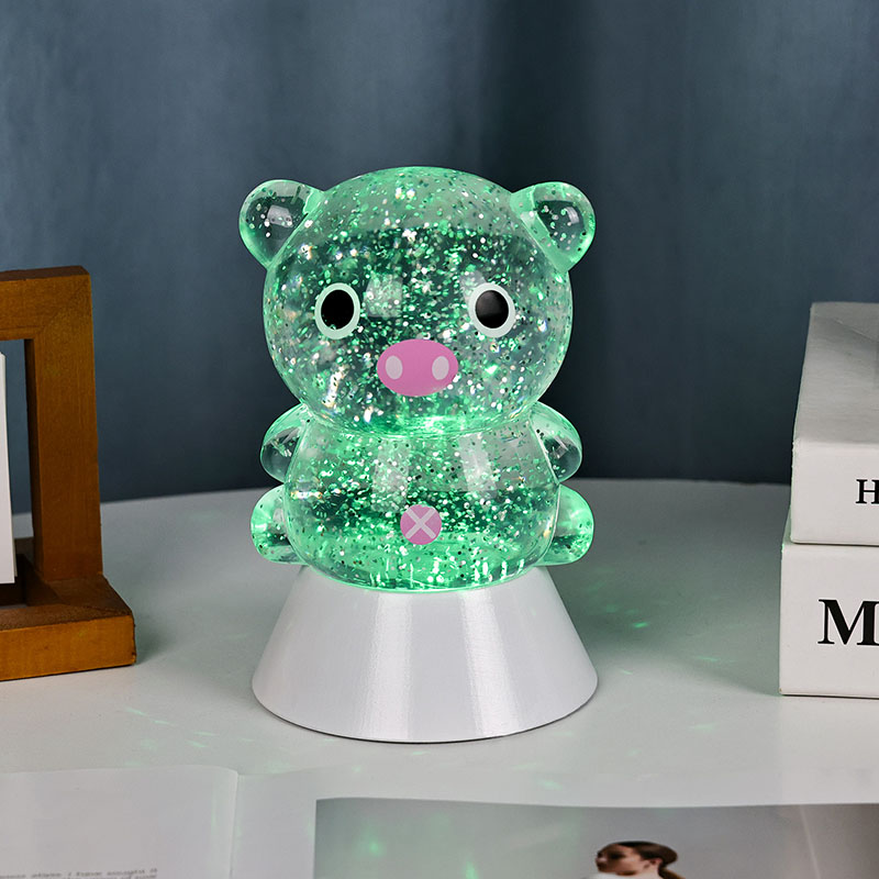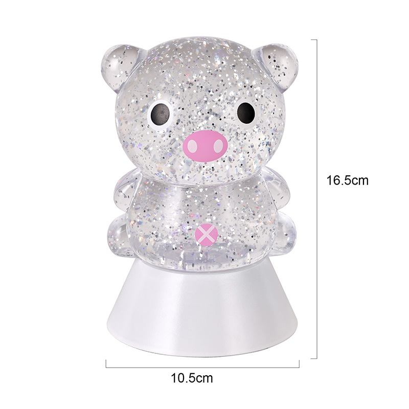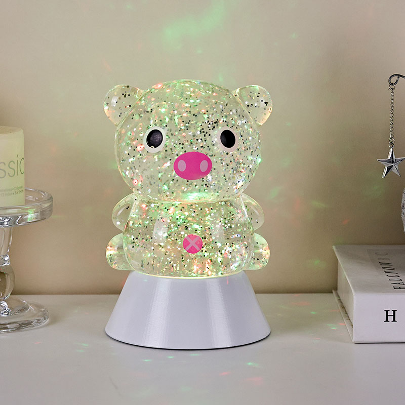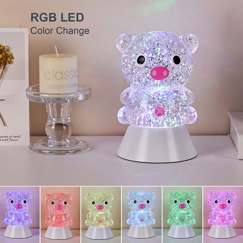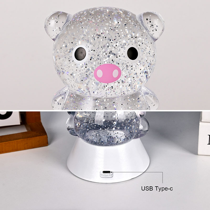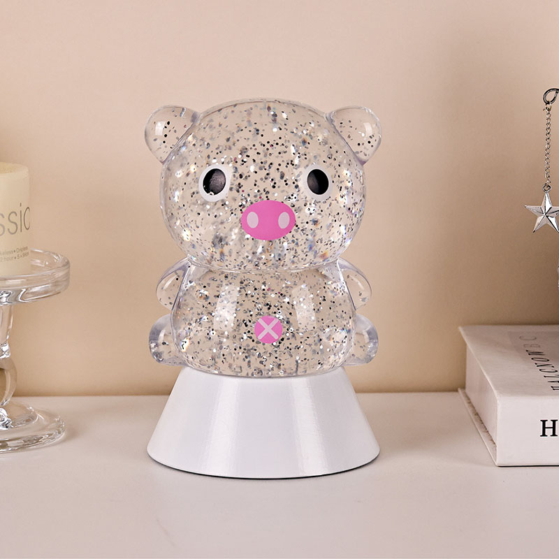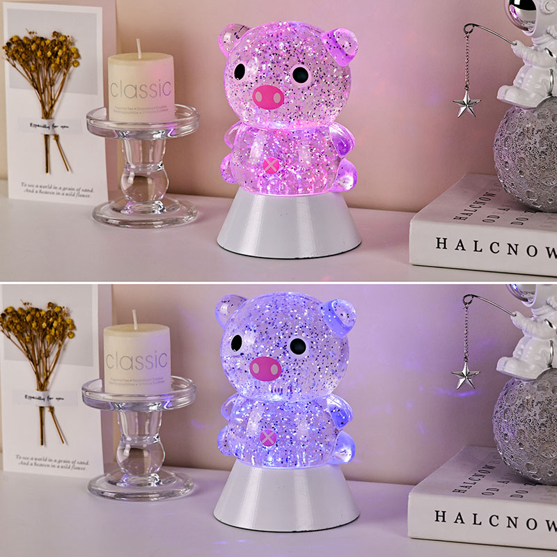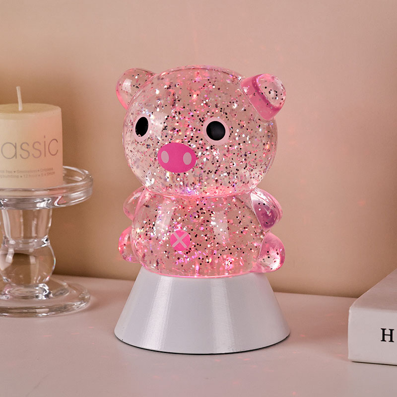 Desain keseluruhannya menampilkan gambar babi yang lucu dan menggemaskan, dengan konturnya yang bulat dan montok dipadukan dengan mata besar, moncong merah muda, dan telinga kecil yang menggemaskan, langsung memikat hati baik orang dewasa maupun anak-anak. Cangkang resin transparan diisi dengan payet berwarna berkilau dan cairan khusus, yang dengan lembut mengalir bersama cairan saat lampu dinyalakan, menciptakan efek visual yang indah seperti sungai berbintang yang mengalir di dalam tubuh babi. Warna-warna terang secara otomatis berputar, beralih dari merah muda lembut dan ungu melamun ke biru dan hijau segar, terus berubah menjadi warna pelangi yang menciptakan suasana damai namun magis, seolah membawa dunia dongeng menjadi kenyataan.