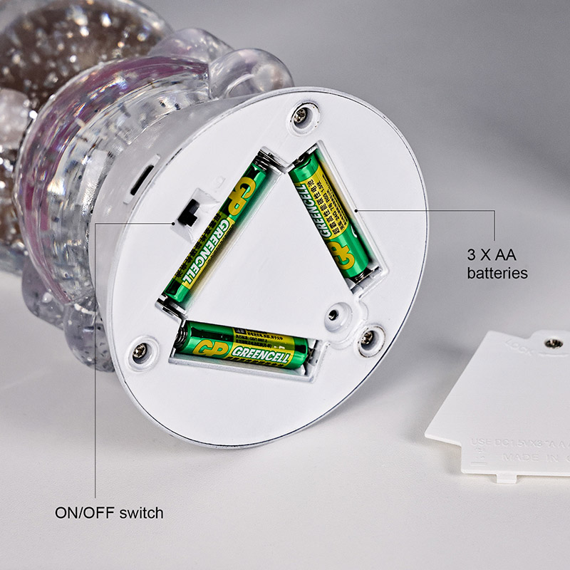 Lampu meja gemerlap RGB warna babi memiliki desain dasar putih yang sederhana dan elegan di bagian bawah, yang tidak hanya meningkatkan estetika keseluruhan tetapi juga meningkatkan stabilitas untuk mencegah terjungkal. Basisnya mencakup kompartemen baterai internal di mana pengguna dapat dengan mudah memasang tiga baterai AAA (tidak termasuk). Tanpa memerlukan colokan listrik, ia menawarkan portabilitas dan ideal untuk ditempatkan di samping tempat tidur, meja, tempat tidur bayi, atau selama perjalanan. Desain sakelar mudah digunakan, memungkinkan kontrol hidup/mati yang mudah hanya dengan satu sentuhan, sehingga aman dan mudah dioperasikan—terutama cocok untuk digunakan secara mandiri oleh anak-anak.