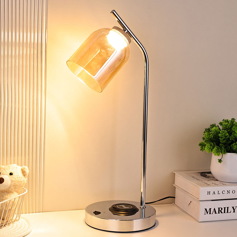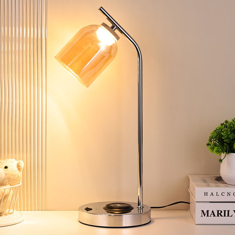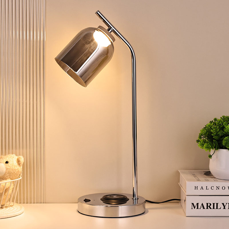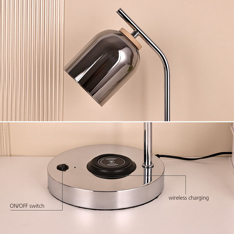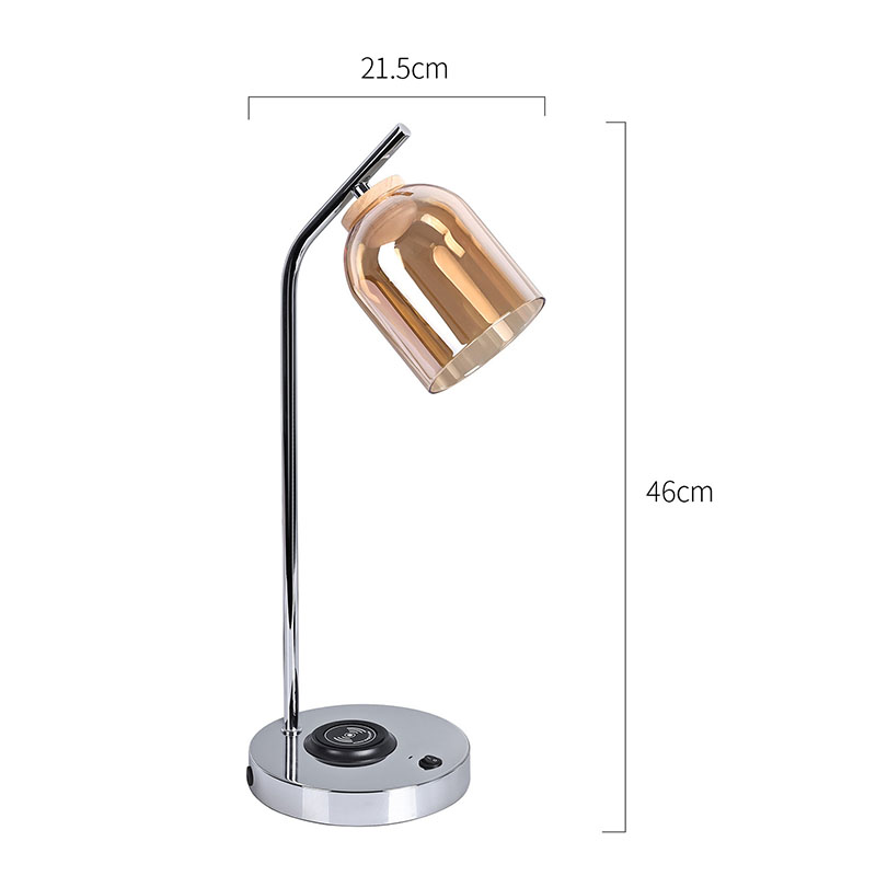 Lampu meja led QI dengan kap kaca dengan alas dan bodi berlapis logam